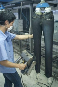 三:臭氧氧化與傳統方法的優缺點比較 1. 用次氯酸鈉(婆梅度為18度)經濟;不好控制,有傷布的纖維。健康危害:經常用手接觸本品的工人,手掌大量出汗,指甲變薄,毛發脫落。本品有致敏作用。本品放出的氯氣有可能引起中毒。具腐蝕性,可致人體灼傷,具致敏性。 2. 用亞氯酸鈉和硫酸在加次氯酸鈉。價格比上一種高點。但比上一種好點。不傷布的纖維。亞氯酸鈉有強氧化性。在175℃時即分解而發熱,與可燃物質接觸,即起猛烈爆炸,須注意安全。硫酸對環境有危害,對水體和土壤可造成酸性污染。具強腐蝕性、強刺激性,可致人體灼傷。 3. 高錳酸鉀、過醋酸和還原漂白方式 關于牛仔布漂白,除了用次氯酸鈉和亞氯酸鈉外,還可以用高錳酸鉀、過醋酸和還原漂白方式,具體需要根據牛仔布所用染料類型來選擇,傳統牛仔為還原淀籃染料,也有用硫化染料或直接染料代替,也有采用活性染料代替的,故此,需要根據具體情況考慮。 4. 臭氧氧化的優點 a) 無污染,臭氧為純凈物。在常溫下,易分解,生成氧氣和氧原子 b) 臭氧的氧化能力極強。 c) 運行成本低 四:手工處理 1.手擦 a) 在洗水前,通過使用砂輪滾動摩擦而使布面染料褪色,手擦的地方通常是脾位和臀位,人為的機械褪色,讓牛褲在洗水后顯得自然地懷舊和泛白 b) 噴沙和手擦效果接近,但對布紋的效果有差別。噴沙后布紋模糊,沉底,而手擦后布紋清晰凸顯